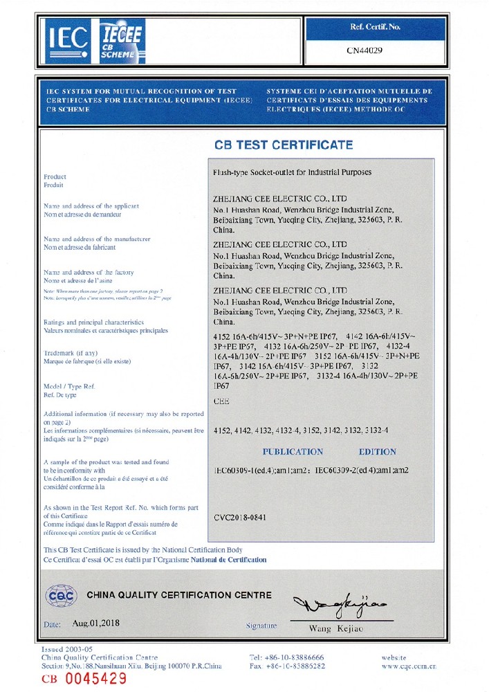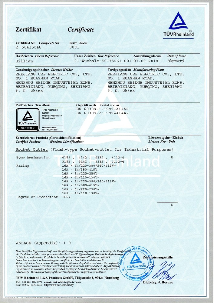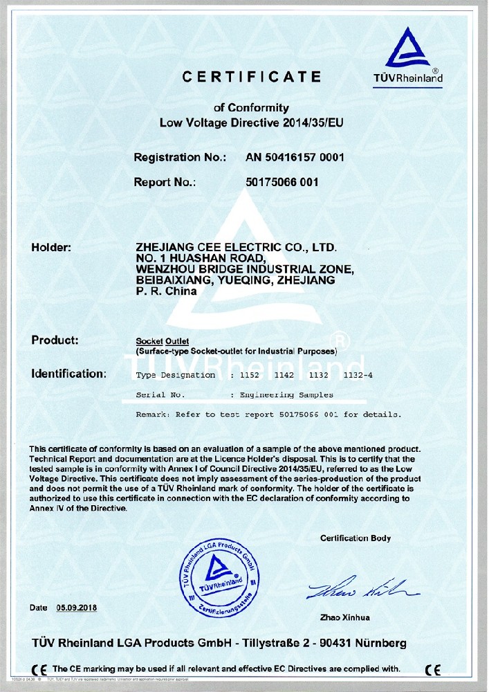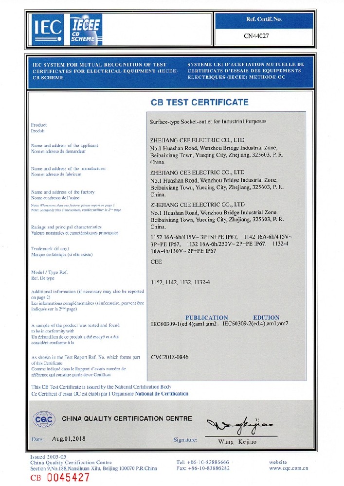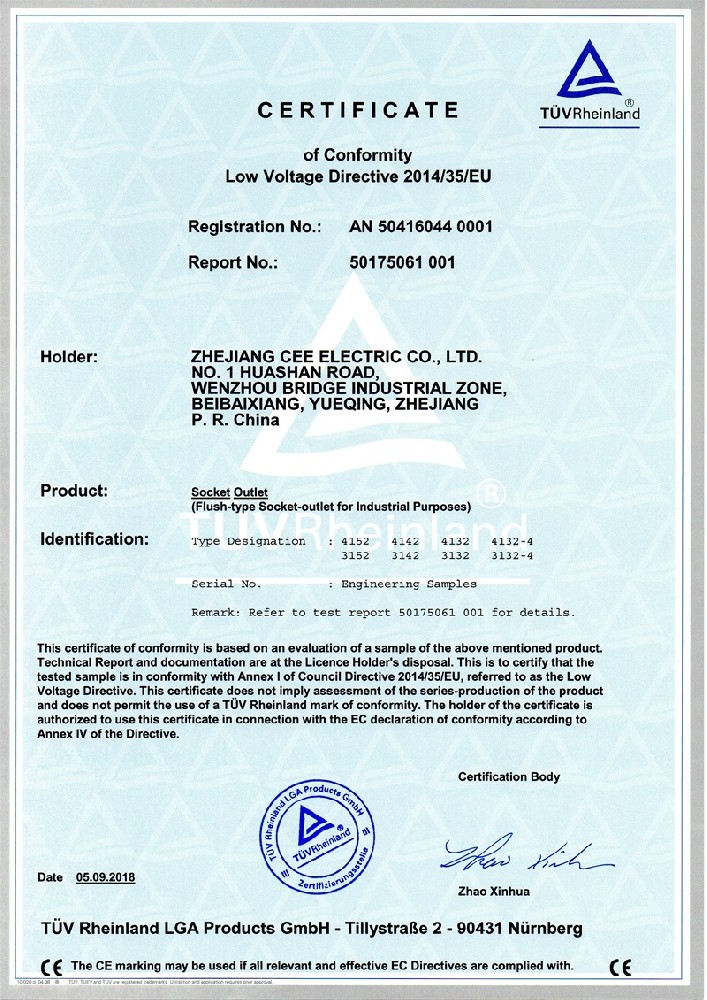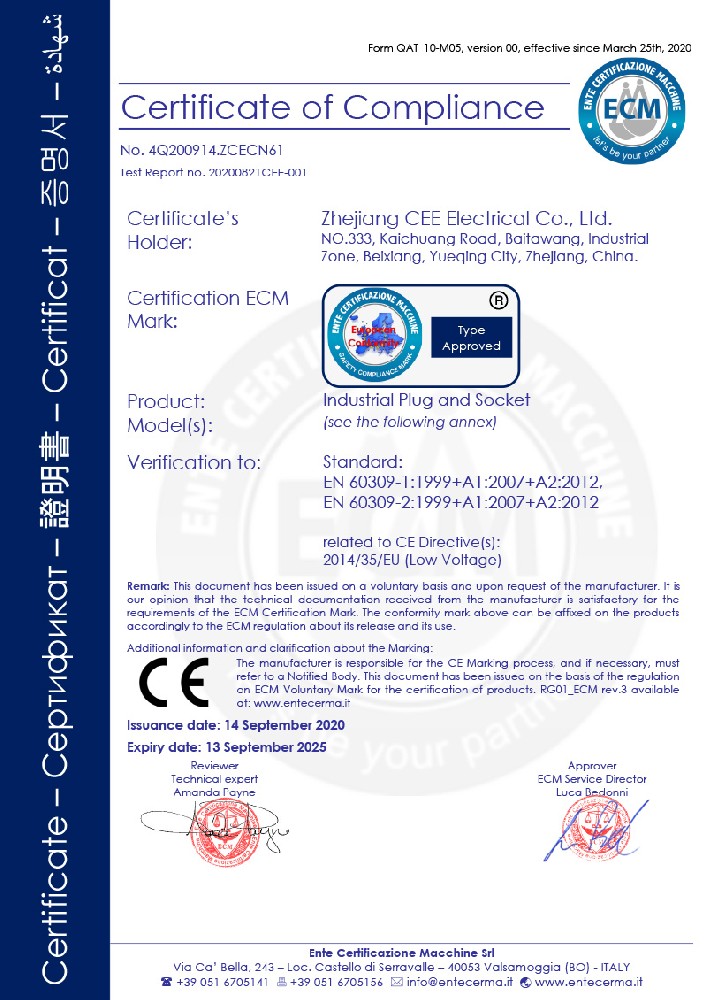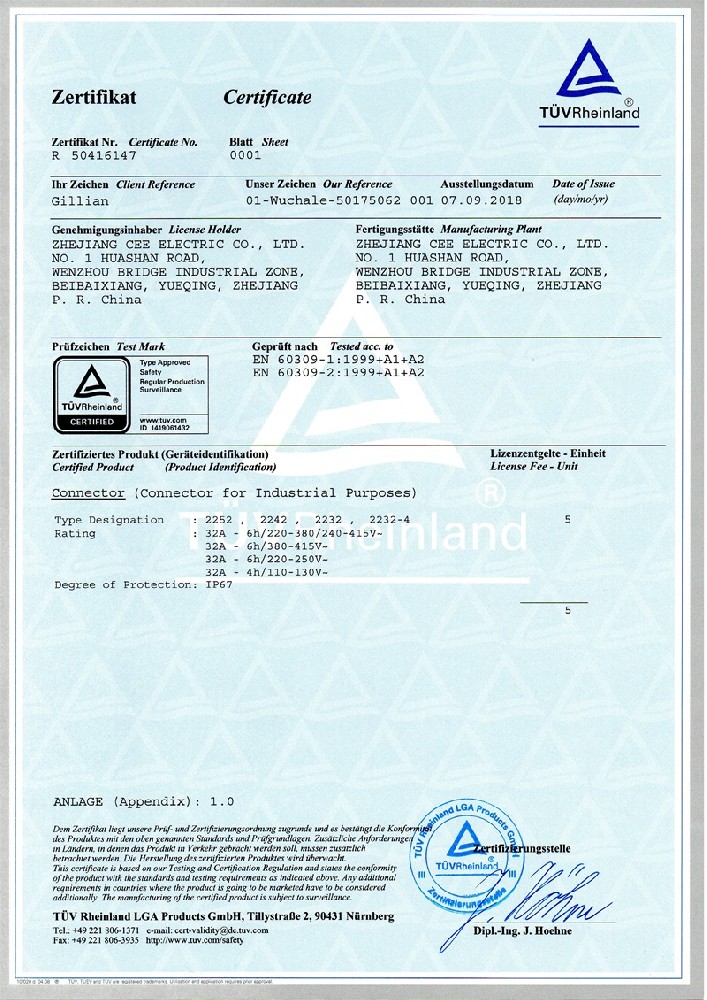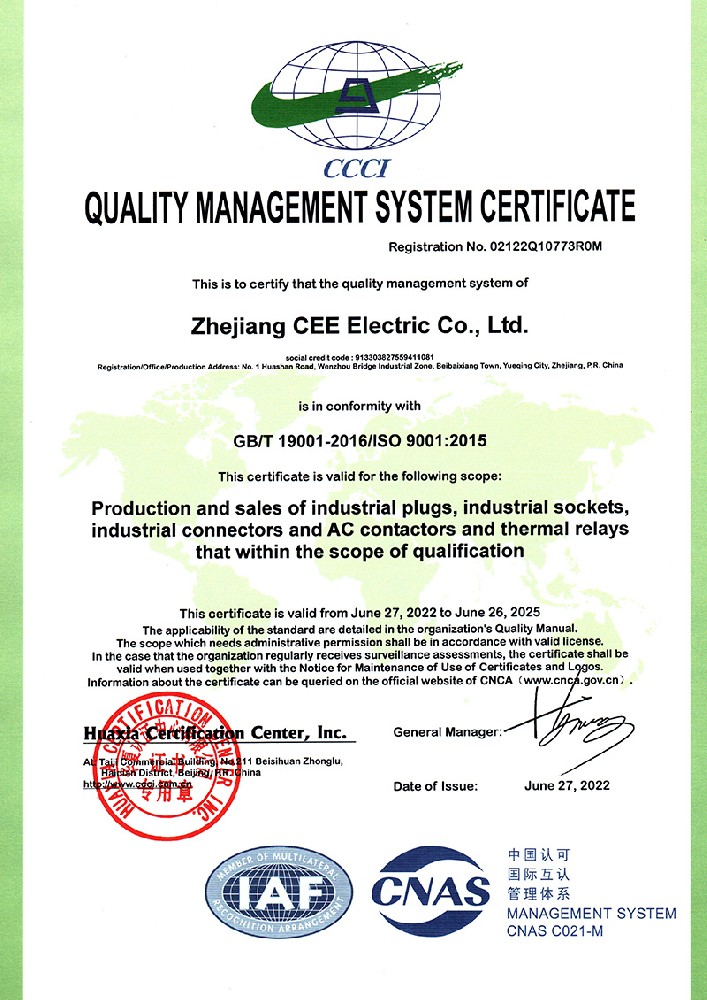 公司全面貫徹實施IS09001:2015質量管理體系認證。工業插頭插座符合IEC 603 09-1-2, EN 60 309-1-2國際標準, 組合插座箱符合EN61439標準,并通過Intertek & TUV Rheinland & CQC等認證。證書包括TUV、SEMKO、CE、CB、EAC,并符合RoHS和Reach等適用法規。公司引進先進生產設備和精密檢測試驗儀器、不斷引入高科技工藝流程和技術人才,為公司的產品研發、質量升級、管理創新提供了強有力的保障。公司將持續以優質的產品和服務,贏得客戶的最大滿意為宗旨,發揚“創新、服務、溝通”的企業精神,力促CEE品牌從中國走向世界。我們牢牢把握時代賦予的使命和機遇,與海內外合作伙伴共同開創事業的新高度。