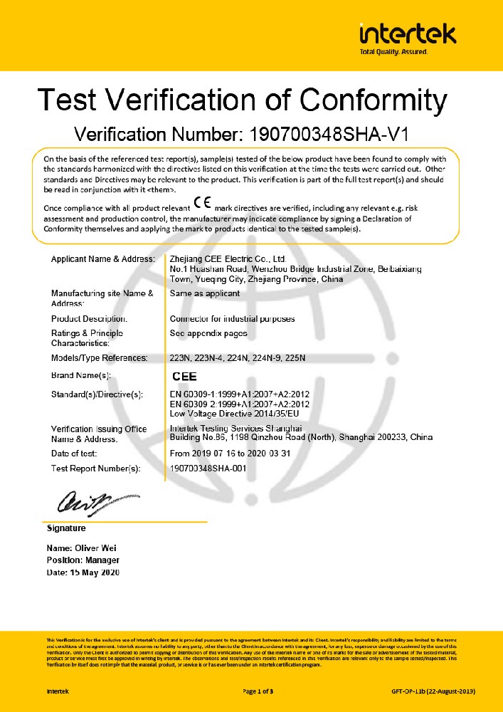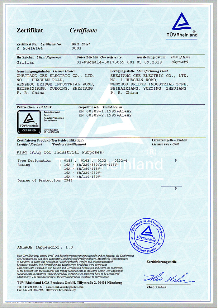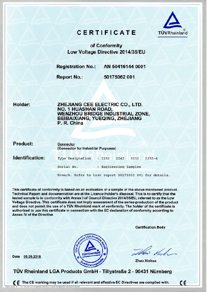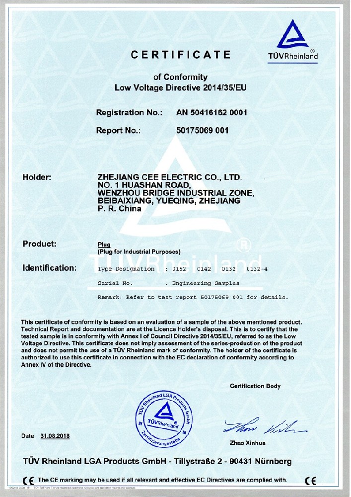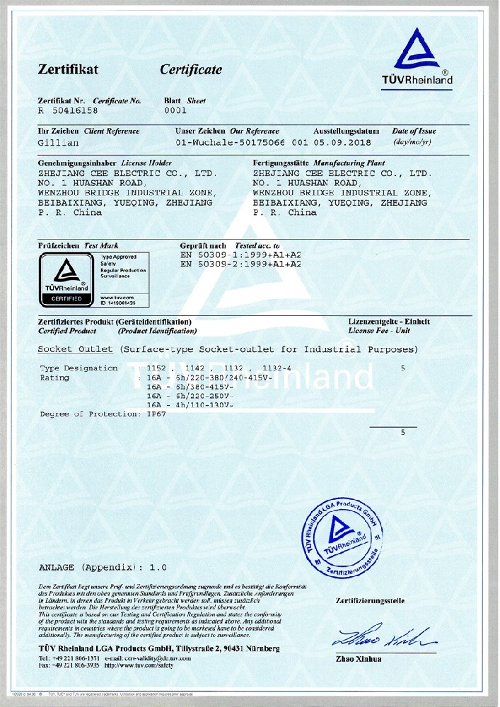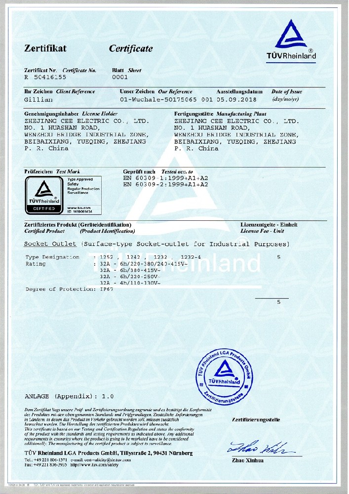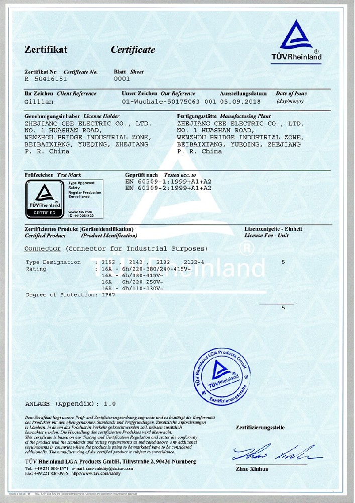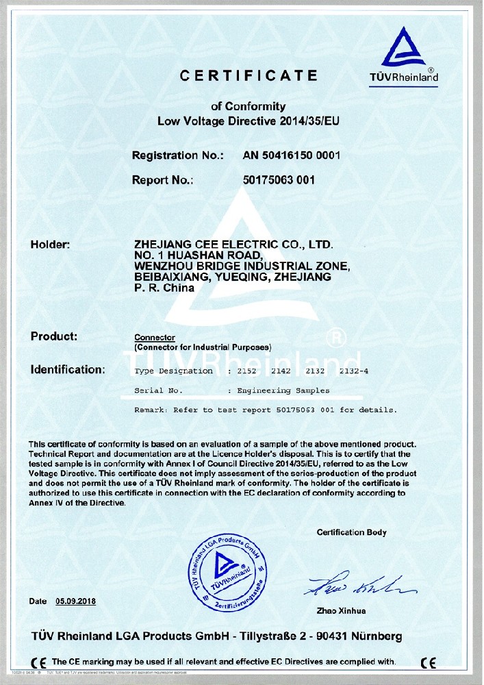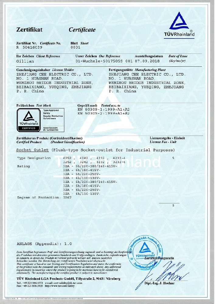 公司全面貫徹實施IS09001:2015質量管理體系認證。工業插頭插座符合IEC 603 09-1-2, EN 60 309-1-2國際標準, 組合插座箱符合EN61439標準,并通過Intertek & TUV Rheinland & CQC等認證。證書包括TUV、SEMKO、CE、CB、EAC,并符合RoHS和Reach等適用法規。公司引進先進生產設備和精密檢測試驗儀器、不斷引入高科技工藝流程和技術人才,為公司的產品研發、質量升級、管理創新提供了強有力的保障。公司將持續以優質的產品和服務,贏得客戶的最大滿意為宗旨,發揚“創新、服務、溝通”的企業精神,力促CEE品牌從中國走向世界。我們牢牢把握時代賦予的使命和機遇,與海內外合作伙伴共同開創事業的新高度。